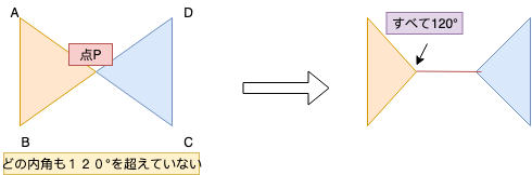 2つの三角形はどの内角も120°を超えていないため、最短距離は三角形の内側になり、その角度は120°となる点になります。